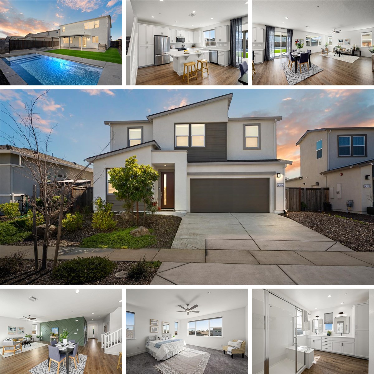 STOP SCROLLING THIS HOME IS ABOUT TO STEAL THE SHOW. Imagine stepping outside to your own heated pool paradise perfect for pool volleyball, summer BBQs, and long evenings under the covered patio. Modern design meets resort-style living and unbeatable outdoor access. Stunning 4 bed, 3 full bath home features a highly desirable downstairs bedroom and full bath, ideal for guests or multigenerational living. The bright open-concept floor plan with 9' ceilings Luxury Vinyl Plank Flooring seamlessly connects the living, dining, and kitchen spaces, while stylish board and batten accent walls add designer flair. The chef's kitchen is built for entertaining with quartz countertops, island with breakfast bar seating, beautiful tile backsplash, premium appliances, gas range, and refrigerator included. Upstairs you'll find a spacious loft perfect for a home office, playroom, or media space, plus a luxurious primary suite with TWO walk-in closets, a large quartz-surround shower, and dual sink vanity. Convenient, upstairs laundry with washer and dryer included. Step outside to your private backyard oasis featuring a rectangular heated pool ideal for pool sports, oversized wading step, thermal solar heating to extend swim season, large covered patio with fans, and low-maintenance artificial turf. Located right near the Dry Creek bike & running trails and just steps to two community parks, and just minutes away from the brand-new Rex Fortune Elementary School. Special features include a finished garage with epoxy floors, Energy Efficient Tankless Water Heater, board & batten accent wall, ceiling storage rack, whisper-quiet garage door opener. Modern style. Resort backyard. Prime West Roseville location. This one checks every box!